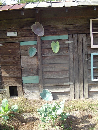 This summer, I started decorating the outside of the shed. I spruced up some old window frames and hung them to add a bit of color. I also tried my hand at leaf casting (making leaves from concrete) and, I’ve hung a few of my early experiments on the wall, too.